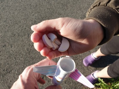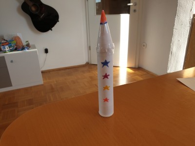 ![]() Špico rakete postavite na tulec in ga zalepite s salotejpom po robu. Pozor. Spodnji del mora biti tisti, ki ima odprtino in katero bomo lahko tudi zaprli s pokrovom. |