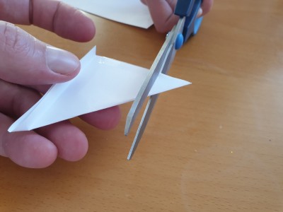 ![]() Sedaj pa stran trikotnika, ki gleda nasproti zavihanega dela odrežite približno 1 centimeter. |