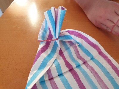 ![]() Okoli tega zavihanega dela dajte še gumico. |