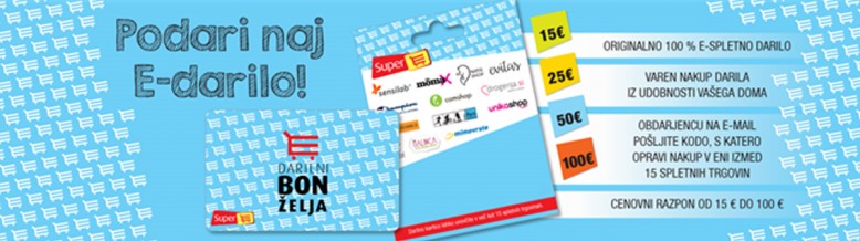Naj vaši najdražji v tem času ne ostanejo brez darila ob rojstnem dnevu, obletnici, rojstvu otroka ali pa zgolj ob zahvali za podporo in dolgoletno prijateljstvo, saj lahko od vas prejmejo e-darilo. Super-E je ime za originalno 100% e-spletno darilo, brez ekološkega odtisa! E-darilo enostavno pošljete osebi, ki jo želite obdariti kar na elektronski naslov, ki vsebuje kodo za nakup v izbrani vrednosti z vašim osebnim voščilom. Je edino e-darilo, ki ga lahko v različnih vrednostih kupite preko spleta in koristite v več kot 15 spletnih trgovinah. Takšno presenečenje je lahko za naše najdražje, prijatelje in znance svetla točka, ki jim bo na obraz narisala nasmeh v teh težkih časih. Če se sprašujete, kako lahko kljub vsemu še vedno obdarujete ter razveseljujete, si oglejte odlične možnosti, ki jih ponuja darilna kartica Super E. Prvič slišite zanjo? Super E je popolna priložnost, da svojim najdražjim podarite tisto, kar si sami najbolj želijo.