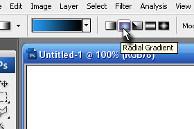 Zgoraj v orodni vrstici določite Radial Gradient in preliv med izbranima barvama (glej sliko).