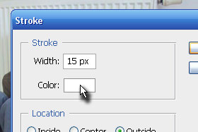 Potem pa kliknite zgoraj na Edit in izberite Stroke... V novem oknu določite belo barvo (glej sliko) in Width okoli 15 px. Potrdite na gumb OK. |
