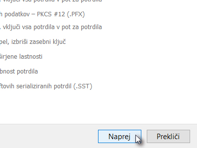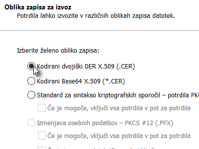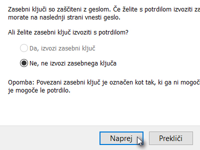 ![]() Pri izvozu morate označiti, da želite zasebni ključ izvoziti s potrdilom. V kolikor te možnosti ne morete izbrati, potem ste pri uvozu označili možnost, da izvoz ni možen. |