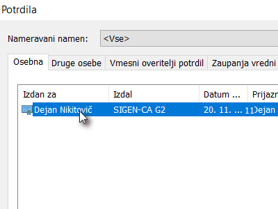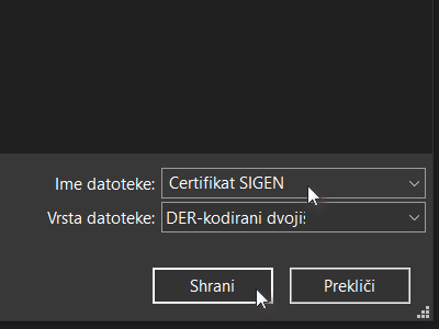 ![]() V novem oknu označite certifikat, ki ga želite shraniti ali izvoziti. |