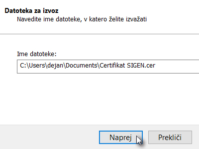 ![]() V novem oknu v polje Ime datoteke vpišite ime certifikata in potrdite na. Prav tako določite mapo shranjevanja. Jaz sem kar na namizje. |
