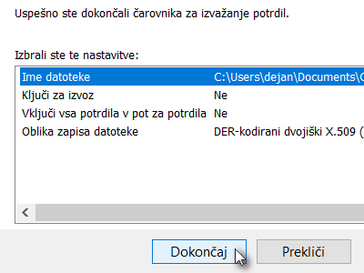 ![]() Certifikat je izvožen. Shranite ga v e-poštni nabiralnik, USB ključek ali pa spletno shrambo. |
