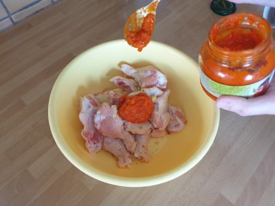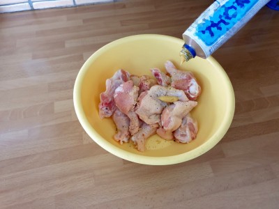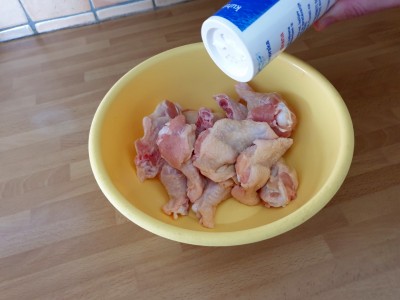 Umijte perutničke ter po potrebi odstranite perje, če je še prisotno. Potem pa perutničke v posodi posolite, popoprajte in dodajte vegeto ali začinko. |
