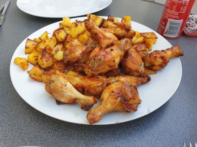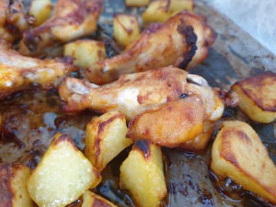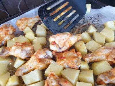 Vse skupaj pečete približno eno uro. Ko perutničke in krompirček dobijo zlato rumeno barvo oziroma porjavijo, je jed pripravljena. |