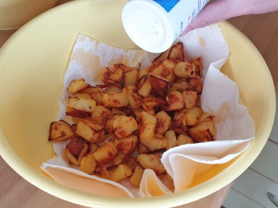Krompirček odcedite v posodi s papirnato brisačo, da se olje malo popivna ter vse skupaj posolite in premešajte. |