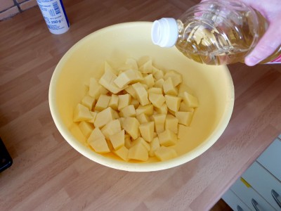 Krompir olupite in narežite na male koščke ter ga malo naoljite. |