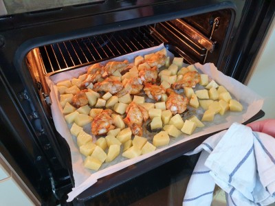 Postavite pripravljeno jed na pekač in peki papir, kjer robove papirja malo zavihate, da olje med peko ne bo odteklo na pekač. Pecite na 200 stopinj Celzija. Čez 15 minut bomo dodali še krompirček. |