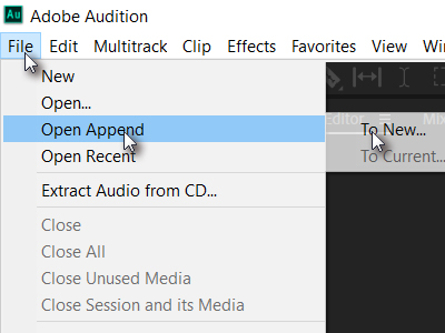 V Adobe Audition kliknite na File, izberite Open Append in izberite To New...