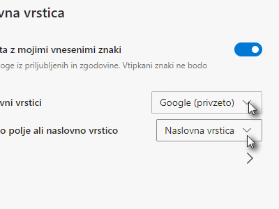 ![]() Mehanizem za iskanje, uporabljen v naslovni vrstici nastavite na Google (privzeto). Iskanje po novih zavihkih uporablja iskalno polje ali naslovno vrstico pa nastavite Naslovna vrstica. |