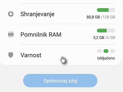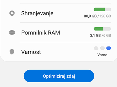 ![]() Kadarkoli boste želeli optimizirati telefon, lahko na strani Skrb za napravo zaženete Optimiziraj zdaj in tako počisite telefon navlake in preverite zaščito. |