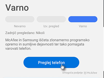 ![]() Telefon je sedaj varen, saj ste vklopili program za iskanje zlonamerne programske opreme in sumljive dejavnosti. Tapnite na Preglej telefon. |