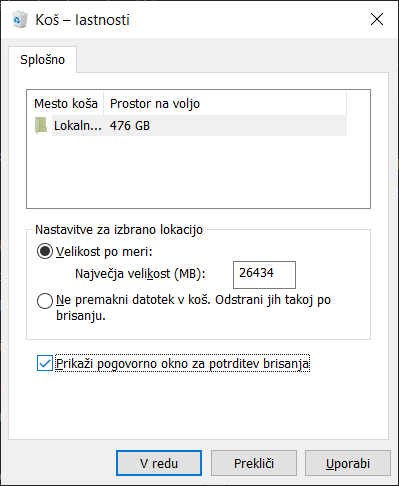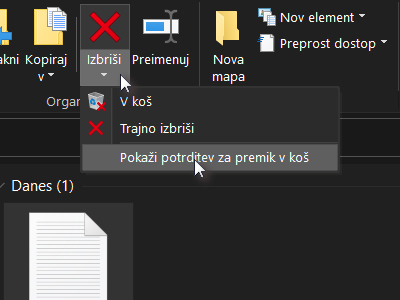 ![]() Zgodaj v orodni vrstici kliknite na puščico, ki se nahaja pod ikono za brisanje (glej sliko) in označite Pokaži potrditev za premik v koš. |