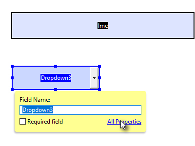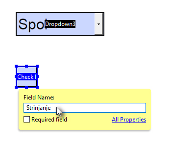 ![]() Klik na dokument in vpišite poljubno ime za izbirno polje (drop down menu). V to polje bo v mojem primeru uporabnik lahko izbral spol. Kliknite z miško na All properties, da odprete lastnosti. |