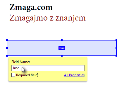 ![]() Potem pa klik ponovno nekaj na dokument in vpišite poljubno ime za vnosno polje. V to polje bo v mojem primeru uporabnik lahko vnesel ime. |