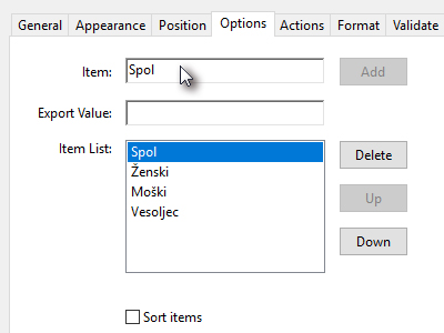 ![]() V oknu z lastnostmi kliknite na zavihek Options in vnesite vse možnosti, ki jih želite uporabniku dati na voljo. Kliknite na gumb OK, ko boste končali. |