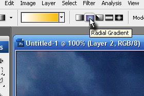 Potem pa pritisnite tipko G, da ponovno izberete orodje Gradient Tool. Zgoraj v orodni vrstici določite Radial Gradient. |