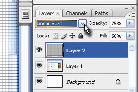 Layerju določite senčenje na Linear Burn, Opacity okoli 75% in Fill okoli 50% (glej sliko). |