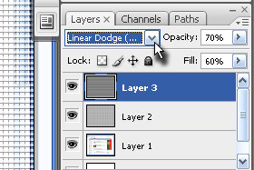 Layerju določite senčenje na Linear Dodge, Opacity okoli 70% in Fill okoli 60% (glej sliko). |