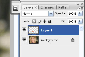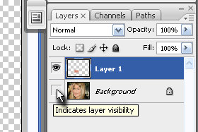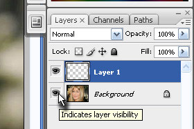 ![]() V paleti layerjev kliknite na kvadratek, kjer je bila ikona z očesom, ki predstavlja vidnost (background) prvotnega layerja (glej sliko). |