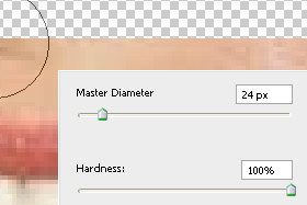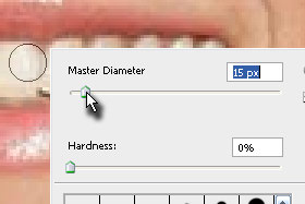 ![]() Kliknite z desnim miškinim gumbom na dokument in določite primerno velikost čopiča (Master Diamter) in Hardness 0% (glej sliko). |