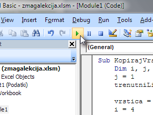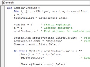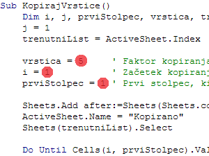 Prilepljeno kodo si lahko povsem prilagodite vašim potrebam. Prva številka, ki jo lahko spremenite je, katere vrstice naj Excel kopira. V moji kodi je številka 5, kar pomeni, da bo Excel kopiral vsako peto vrstico. Če vpišete številko 1, bo skopiral vse vrstice, če vpišete številko 2, bo skopiral vsako drugo vrstico in tako naprej. Naslednjo spremenljivko sem poimenoval i. Tukaj nastavite, od katere vrstice naj začne Excel kopirati. Če pustite številko 1, pomeni, da bo Excel začel kopirati pri prvi vrstici na listu. Če vpišete številko 10, bo začel kopirati šele od desete vrstice naprej. Tretja spremenljivka Excelu pove, kje se nahajajo vaši podatki. Excel namreč v kodi preveri, ali je že prišel do konca vaših podatkov, za kar pa potrebuje številko stolpca, v katerem se nahajajo podatki. V mojem primeru se podatki začno že v prvem stolpcu, zato je zapisana številka 1 ...