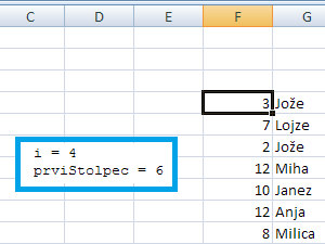i = 4 vrstica = 6 F je šesti stolpec po vrsti :)
