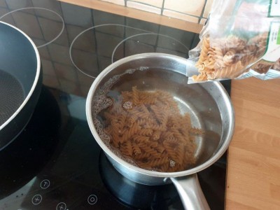 V lonec z vrelo vodo dodajte toliko polnozrnatih testenin, kolikor jih boste pojedli. Lahko dodate tudi navadne testenine. Kuhajte toliko časa, kolikor je napisano na embalaži testenin.