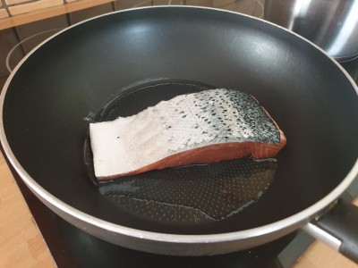 Postavite ponev na srednje močno kuhalno ploščo ter dolijte nekaj kapljic olja. Ko bo olje segreto, postavite nanj kos pripravljenega lososa. Pecite ga na obeh straneh toliko časa, dokler se ne bo lepo zapekel in vmes odtranite kožo. |