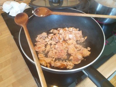 Ko bo pečen, ga s pomočjo kuhalnic razdrobite na manjše koščke (glej sliko). |