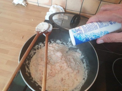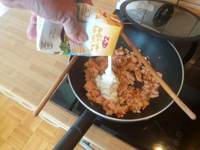 Čez 1 minuto dodajte še smetano za kuhanje. Dodajte jo toliko, kolikor želite. Jaz sem dodal še pol kozarca vode, da je omaka postala bolj gladka. |