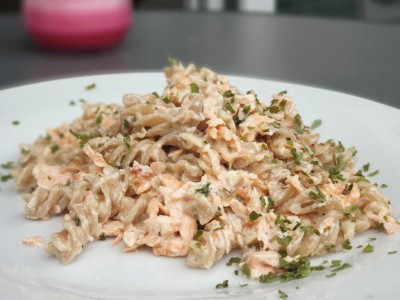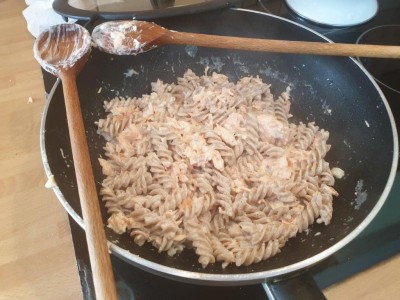 Ko bodo testenine kuhane, jih odcedite ter dodajte k pripravljeni omaki z lososom. Vse skupaj dobro mešajte še 2 minuti ter dodajte še malenkost vode, če je to potrebno. |