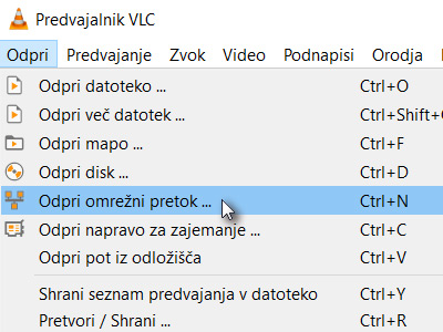 ![]() V VLC predvajalniku kliknite Odpri in izberite Odpri omrežni pretok ... |