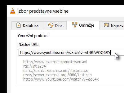 ![]() V novem oknu pod zavihek Omrežje prilepite v polje Naslov URL prej kopiran naslov. Kliknite Predvajaj. |