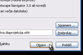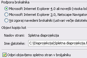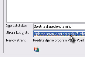 Shrani kot vrsto pa določite Spletna stran v eni datoteki (*.mht). V tem primeru bo spletna diaprojekcija delovala samo v Internet Explorer-ju. Če želite diaprojekcijo shraniti tako, da bo delovala v drugih brskalnikih, morate izbrati Spletna stran (.htm), vendar pa bo sestavljena iz veliko datotek. |