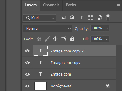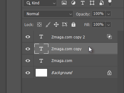![]() Kliknite zgoraj na Layer in izberite Duplicate layer. Ponovite postopek, da boste imeli tri tekstovne layerje (glej sliko). Zgornji layer naj ostane označen. |