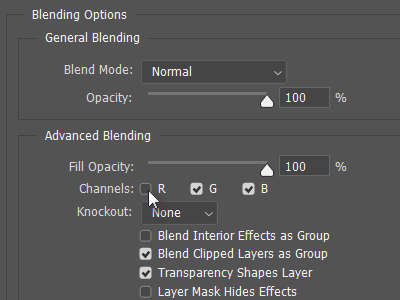 ![]() Kliknite zgoraj na Layer, Layer Style in izberite Blending Options... V novem oknu izklopite G (green) in B (blue) kanala (glej sliko). Kliknite na gumb OK. |