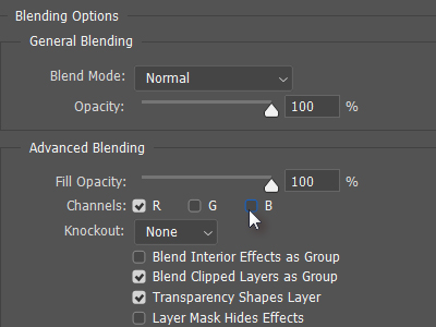![]() Kliknite zgoraj na Layer, Layer Style in izberite Blending Options... V novem oknu izklopite R (red) kanal (glej sliko). Kliknite na gumb OK. |