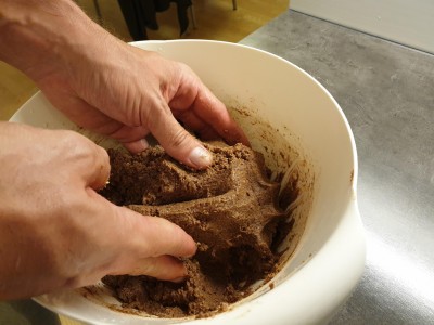 ... in z rokami zgnetite maso. Ko bo masa postala ne preveč lepljiva in ne preveč suha, bo pripravljena. Postavite jo v hladilnik in jo pustite v njem čez noč. Dodajte mleko ali mlete orehe ozrioma mlete piškote, če bo masa preveč lepljiva. Lahko dodate še sladkor v prahu, če vam bo masa premalo sladka. |