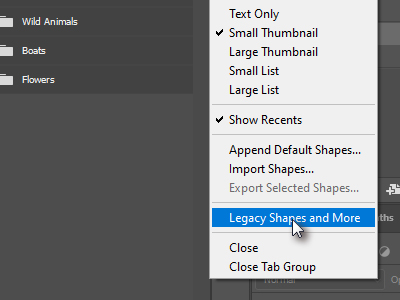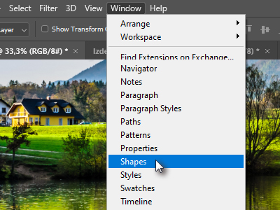 ![]() Ker želimo klasične oblike nazaj, bomo kliknili zgoraj na Window in izbrali Shapes. |