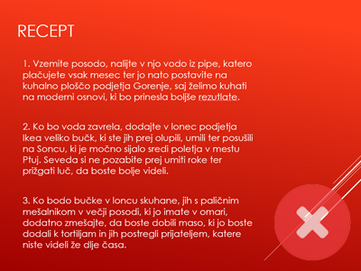Ampak s tem hitro prideš do problema, da je na prezentaciji preveč teksta, še slabše pa je, da se potem iz prezentacije dobesedno bere, kar poslušalci ravno ne cenijo. Tako da, kot piše v vodiču, naj bo teksta malo in naj bodo res samo oporne točke, razlaga pa se pove. Res pa je, da se je zato treba nekoliko več pripraviti, ampak kot pri vseh stvareh, za kvaliteto je potrebno vložiti nekoliko več truda. |