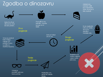 ![]() Kaj pa če bi zilijon informacij predstavili na način, da se vsak dogodek posebej obrazloži. Tudi, če bo predstavitev imela več strani, ni nujno, da bo trajala dlje časa. Koncentracija občinstva bo ostala visoko, pa še nekaj jim boste razložili. Vsi zmagate! |
