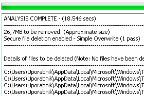 V mojem primeru bo skupno izbrisanih 26,7 MB datotek. Uporabilo se bo varnostno brisanje z enim prepisom (več o tem kasneje). Sedaj moramo klikniti še na Run Cleaner. Program nas vpraša za potrditev brisanja, kliknemo OK. |