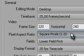 Edition Mode določite Desktop in Timebase pustite 25,00 frames/second.