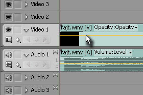 Uvožen video posnetek povlecite v spodnji del okolja (glej sliko), kjer je časovni trak za Video 1.