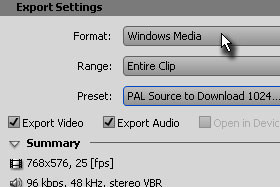 V polju Export Settings pod Format določite Windows Media, Range Entire Clip in Preset Pal Source to Download 1024k. Export Video in Export Audio naj bosta označena. Ne zaprite še okna... |