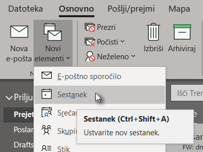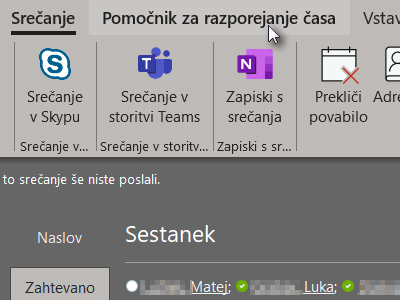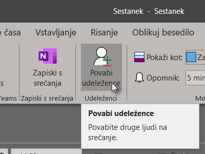 ![]() V Outlooku ustvarite nov sestanek. Ta možnost deluje le v primeru, da je celotno podjetje priklopljeno na enak sistem, torej vsi uporabljajo Outlook.